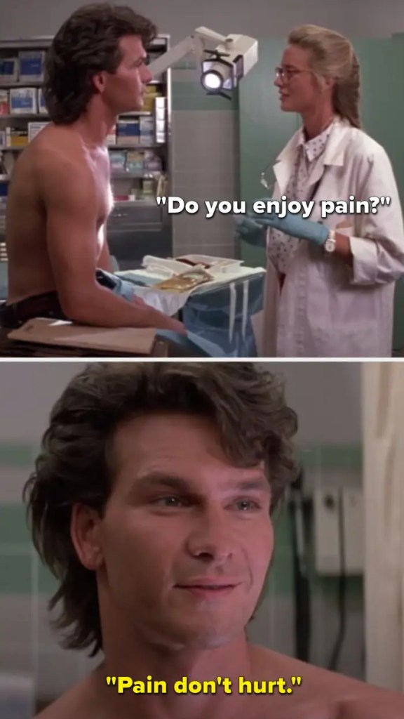I love that movie – it has some of the best bad dialogue that ever made it onto the screen. As an example, the bar bouncer/philosophy major protagonist Dalton (played by Patrick Swayze and named Dalton because of course he was named Dalton), after getting stabbed in a bar fight, meets the love interest doctor, played by Kelly Lynch – in the ER, as she tended to his wound. He insisted that she not use any numbing agents as she sews him up, to which she says “Do you like pain, Dalton?”. Dalton’s response: “Pain don’t hurt.” C’mon! AI could never come up with anything better than that!