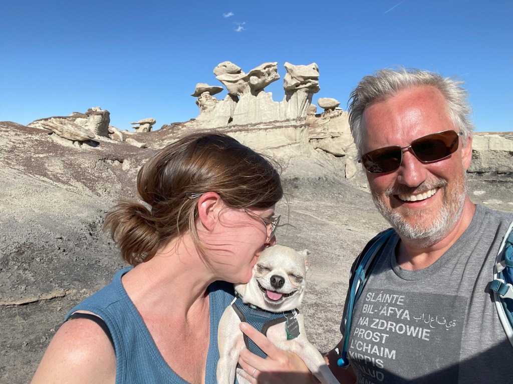 After three nights at Ghost Ranch, we headed out to Bisti/De-Na-Zin Wilderness Area, which is maintained by the Bureau of Land Management (BLM). We were very excited about this stop because we plan on spending a lot of time boondocking on public lands on this trip, and this was our first true boondocking experience. If you’ve heard the term “boondocking” but are unfamiliar with what it exactly entails, there’s a tremendous amount of beautiful country where you are allowed to camp for no cost. It’s all first come/first served, and it’s often called “primitive camping”, because there’s usually no public bathrooms or showers, no water, no electricity, and no “dump stations” (dump stations are where you get rid of your used water, kept in your RV in what are called gray tanks for your shower and sink waste water, and black tanks for your toilet waste water). We feel like we’re pretty well set for boondocking – we have plenty of solar power and lithium ion battery capacity, we have large fresh water and black and gray water tanks, and we have Starlink for satellite internet access. We also have some bladders that would let us shuttle in additional fresh water if needed, or in another bladder, shuttle out waste water if needed.