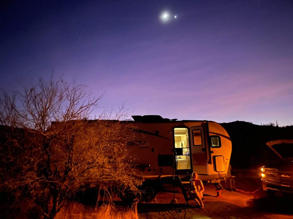 This is a really beautiful corner of the world. We found a nice spot to boondock near the Picketpost trailhead, which is a starting point for a bunch of wonderful trails in the area. We’re set apart from any other campers, which is always nice – it gives views like this: