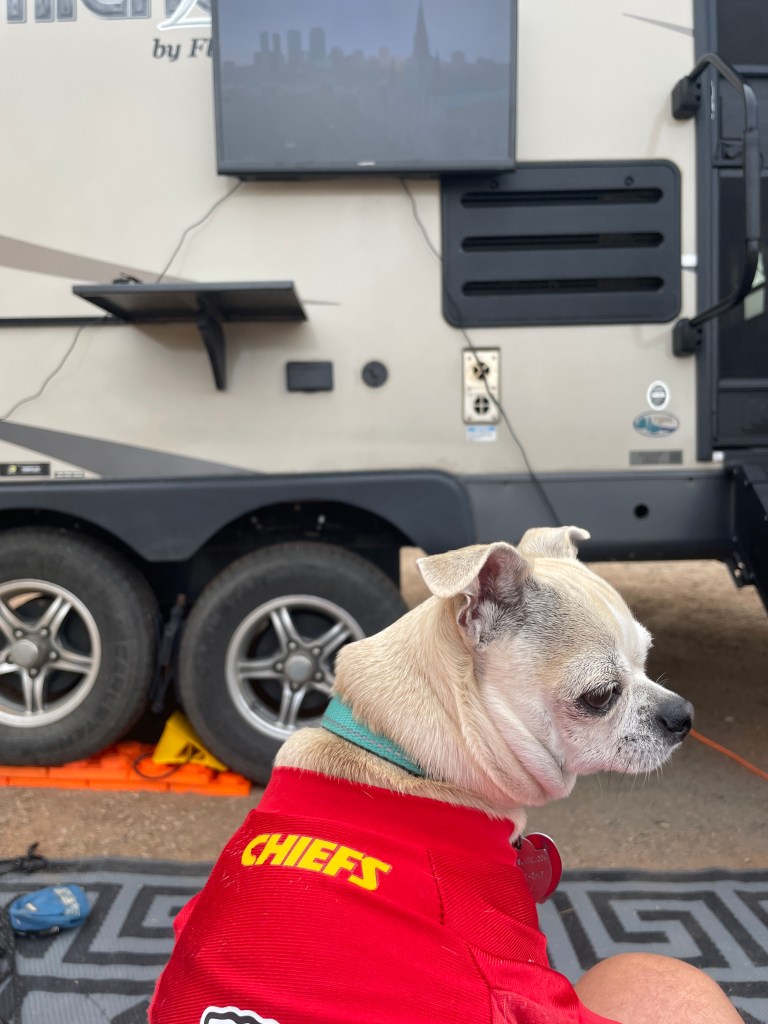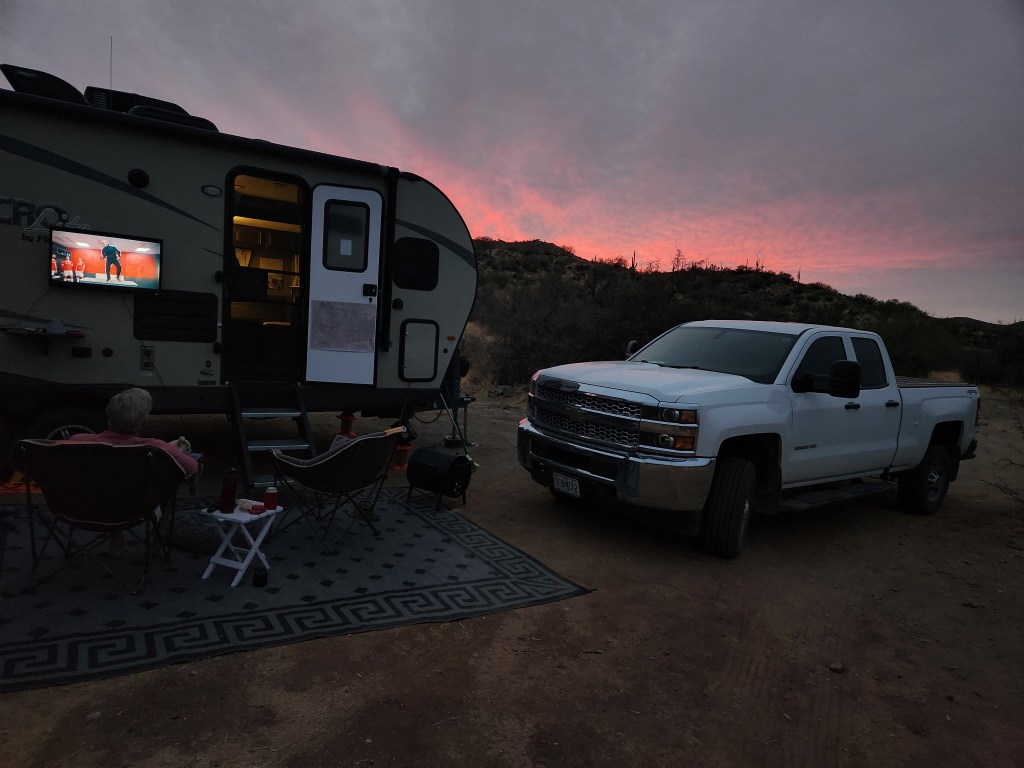 But you know… it’s just hard to feel blue. I enjoy sports a lot, but as I’ve gotten older, I try to not tie my emotional happiness to it to a point where a bad outcome in a game gets me down. We watched the Chiefs lose on a TV we mounted to the side of the trailer and we had a beautiful sunset for a backdrop. It’s hard to get too blue when life is going this rosy.