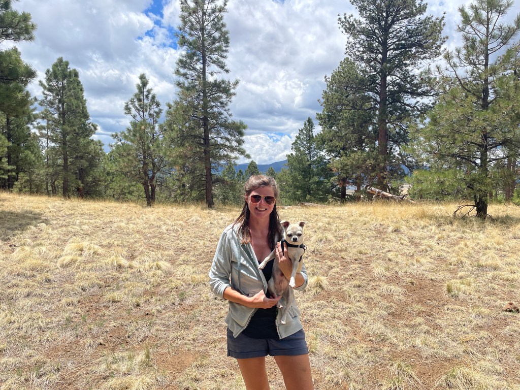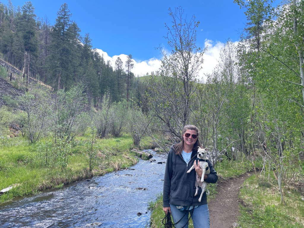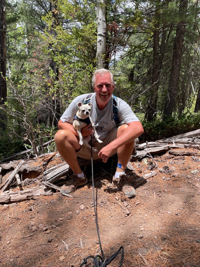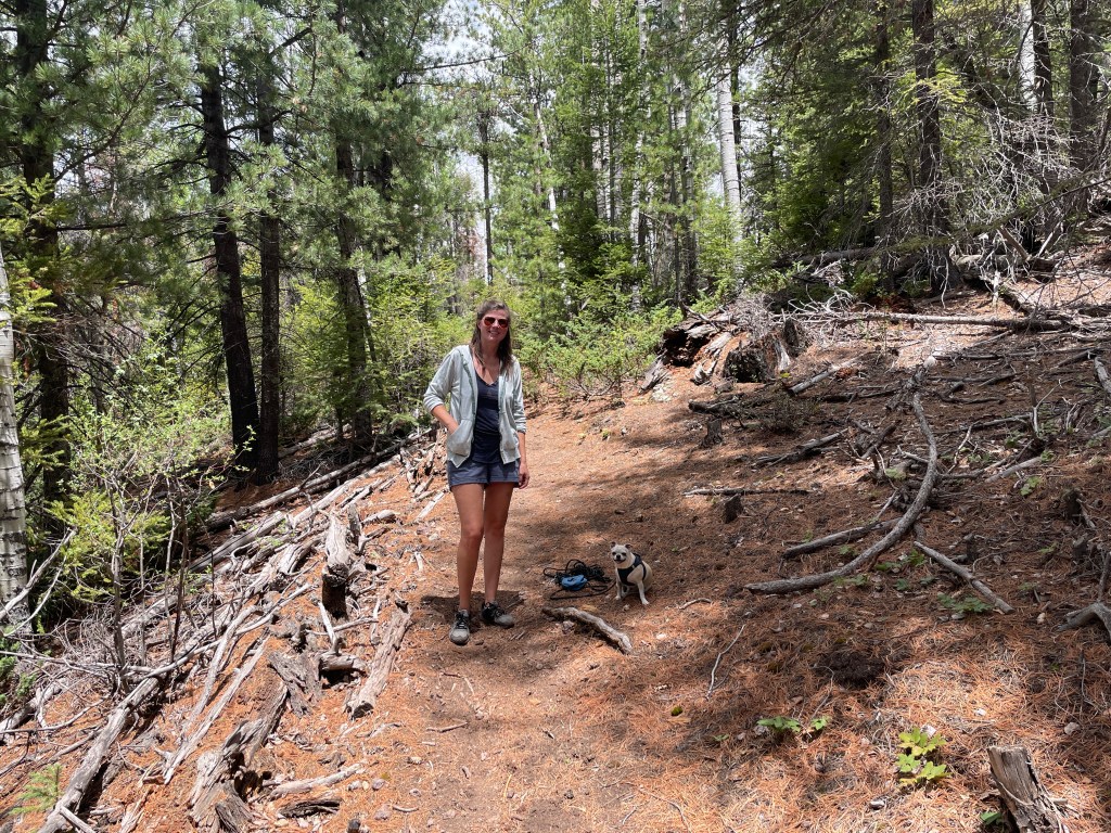 There are some nice hiking trails in the area, we’ve seen some nice wildlife (elk, mule deer, cool lizards, hummingbirds, and some very fresh mountain lion scat thankfully without the mountain lion, and we had a lone grey wolf strolling through our field early this evening), and the weather has been nice. It’s always fun to have a sunny day, but we also really love a good storm, and since we arrived in the area this past Friday, we’ve had brief rainstorms (sometimes with hail) pass through pretty much daily, which has been cool to watch too. The highs have been in the low- to mid-70’s, which has really suited Nico well. After struggling with the heat a bit in the lower altitudes, he’s been a true mountain dog up here on our hikes!