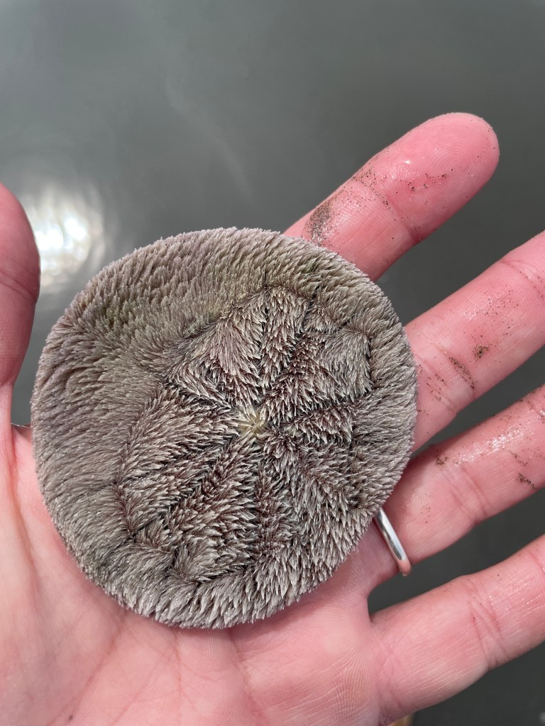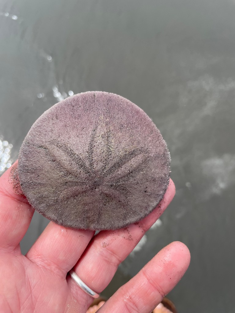 Pretty much every day out here, we’ve done some exploring up and down the beach. Not just South Beach by our campground, but also at Ruby Beach and Kalaloch. We’ve found tons of sand dollars (including one that was still alive, which we promptly scooted back into the ocean – that lucky guy is pictured below) and a few rays and tons of Dungeness crab, along with cool rocks and driftwood.