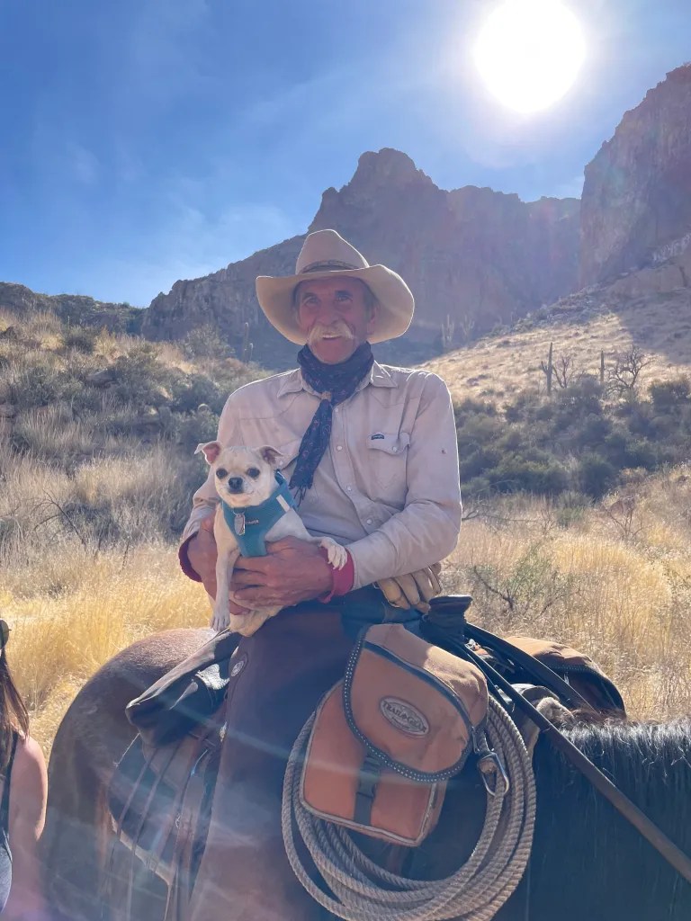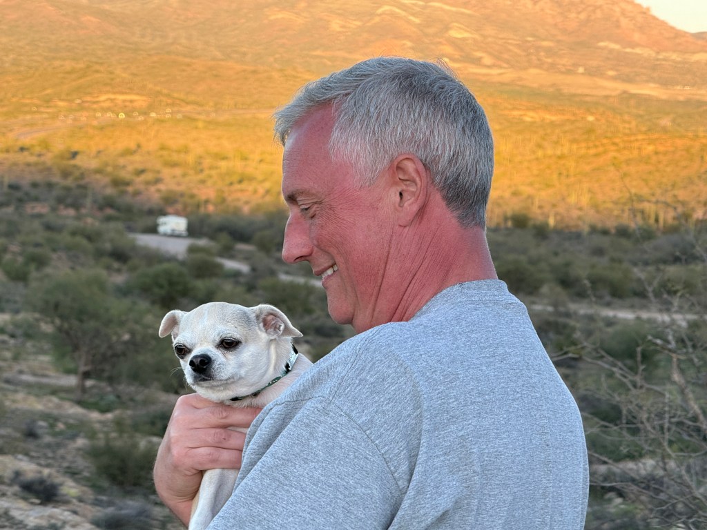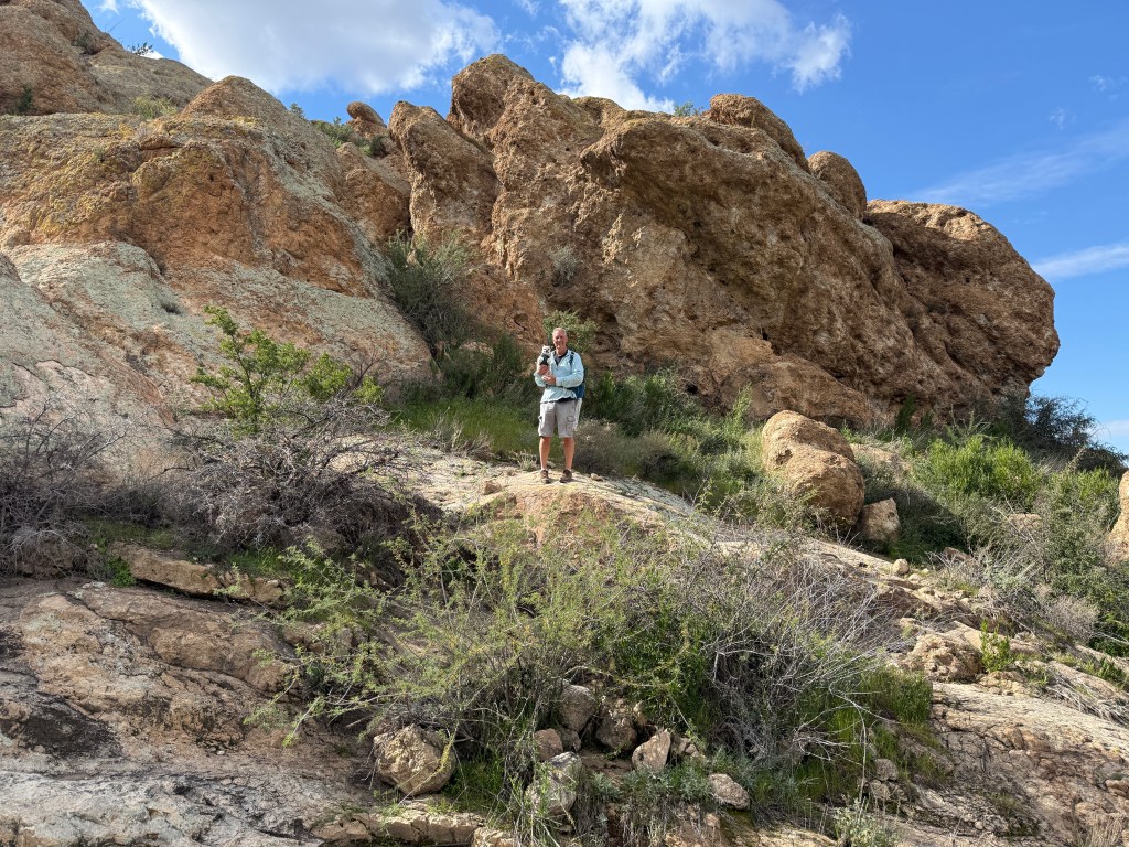 Our spot of choice in Tonto National Forest is at the feet of the impressive Picketpost Mountain. There’s plenty of spots to boondock on the west side of the mountain, and there are beautiful trails all around the place giving you new and stunning views of the mountain from every side. If you read my post last year from this area you may remember that while we were here last January/February, we met Sam Elliott’s brother-from-another-mother, whose name is either Lynn or Jim (that’s Picketpost Mountain right over his hat):